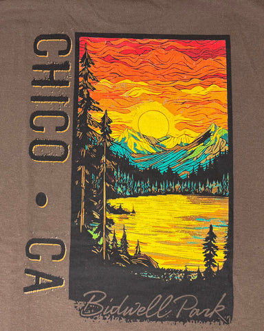 This fun graphic T-shirt is perfect for showing off your love of Chico! A gorgeous rendering of the sun over a forested lake just like the surround...