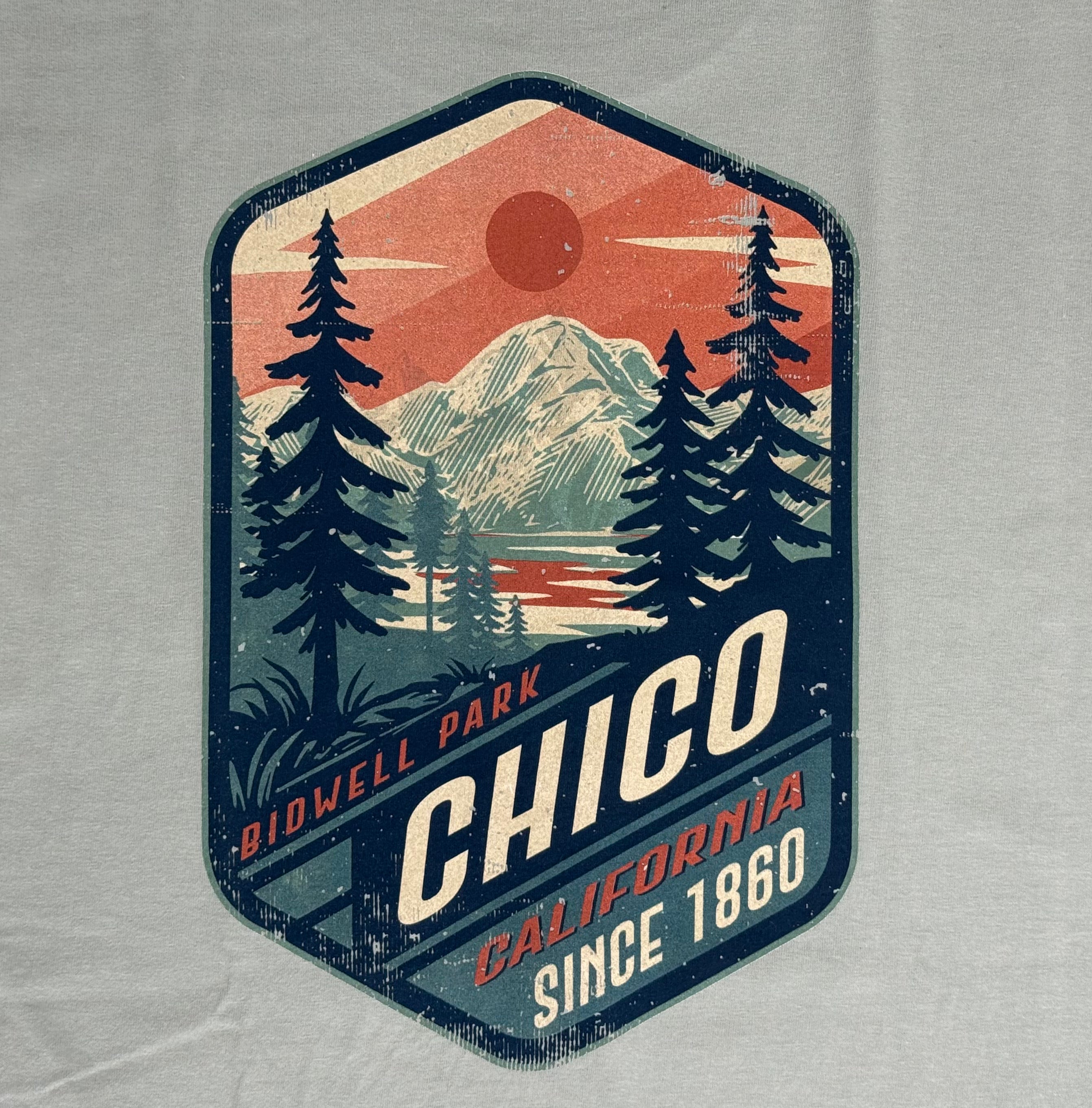 This fun graphic T-shirt is perfect for showing off your love of Chico! A classic design of the Mountains and Forest with a shoutout to Chico and Bidwell Park.