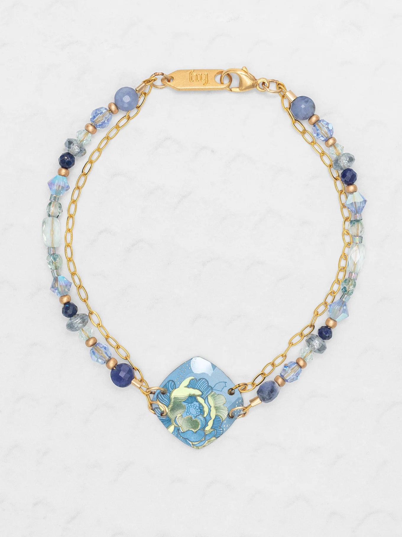 Bridging the past with modern panache, the Elena Beaded Bracelet features delicate double strands—one of metal links, the other of gemstones and crystals—centered with floral art on hand-dipped niobium. Vintage-inspired? Definitely. Yet its modern allure makes this pretty wrist piece a standout in any setting.