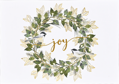 Two chickadees perch on a wreath of evergreens, mistletoe, and holly that encircles the word ''Joy'' on these charming greeting cards. Premium car...
