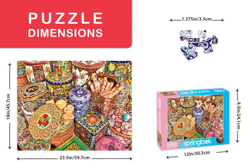 The Cookie Tins 500 Piece puzzle from Springbok measures approximately 23.5 x 18” when completed (59.6 x 45.7cm).